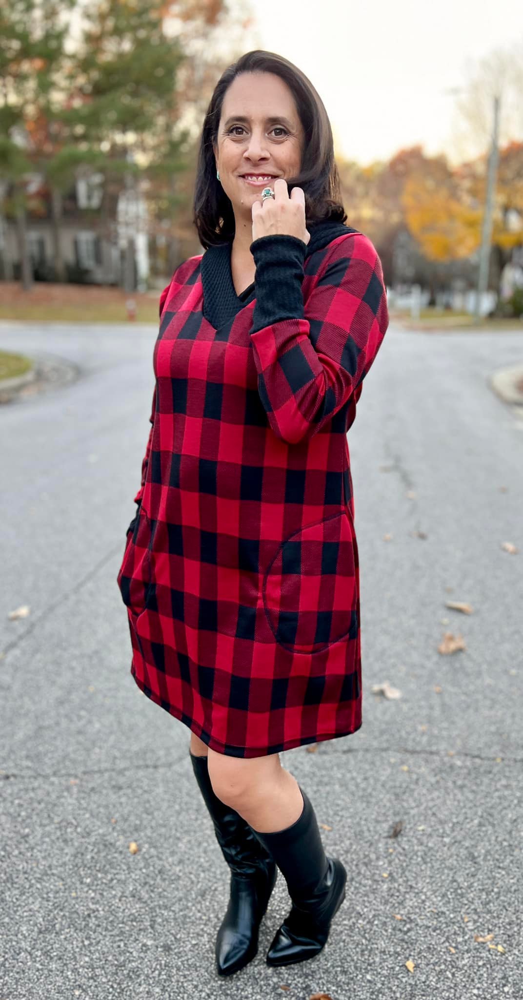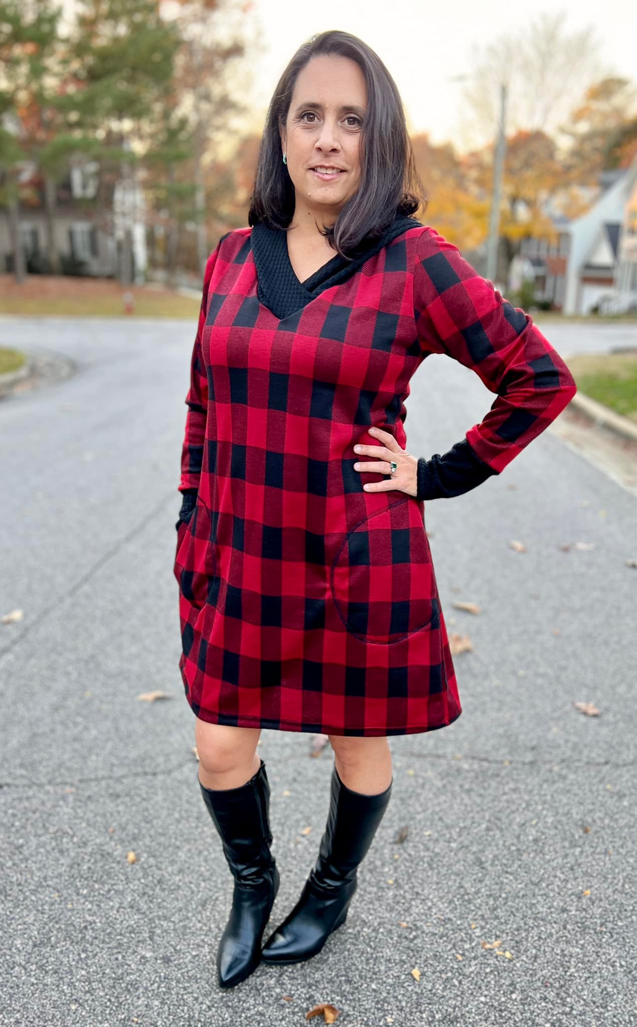 Kim chose to make the dress version out of a gorgeous buffalo plaid. She went with the shawl collar neck and long sleeves with cuffs. I love how the contrast of solid black pops against the main plaid. And of course she added the new pockets. So now she has a cute comfy dress with POCKETS!!!! What could be better???