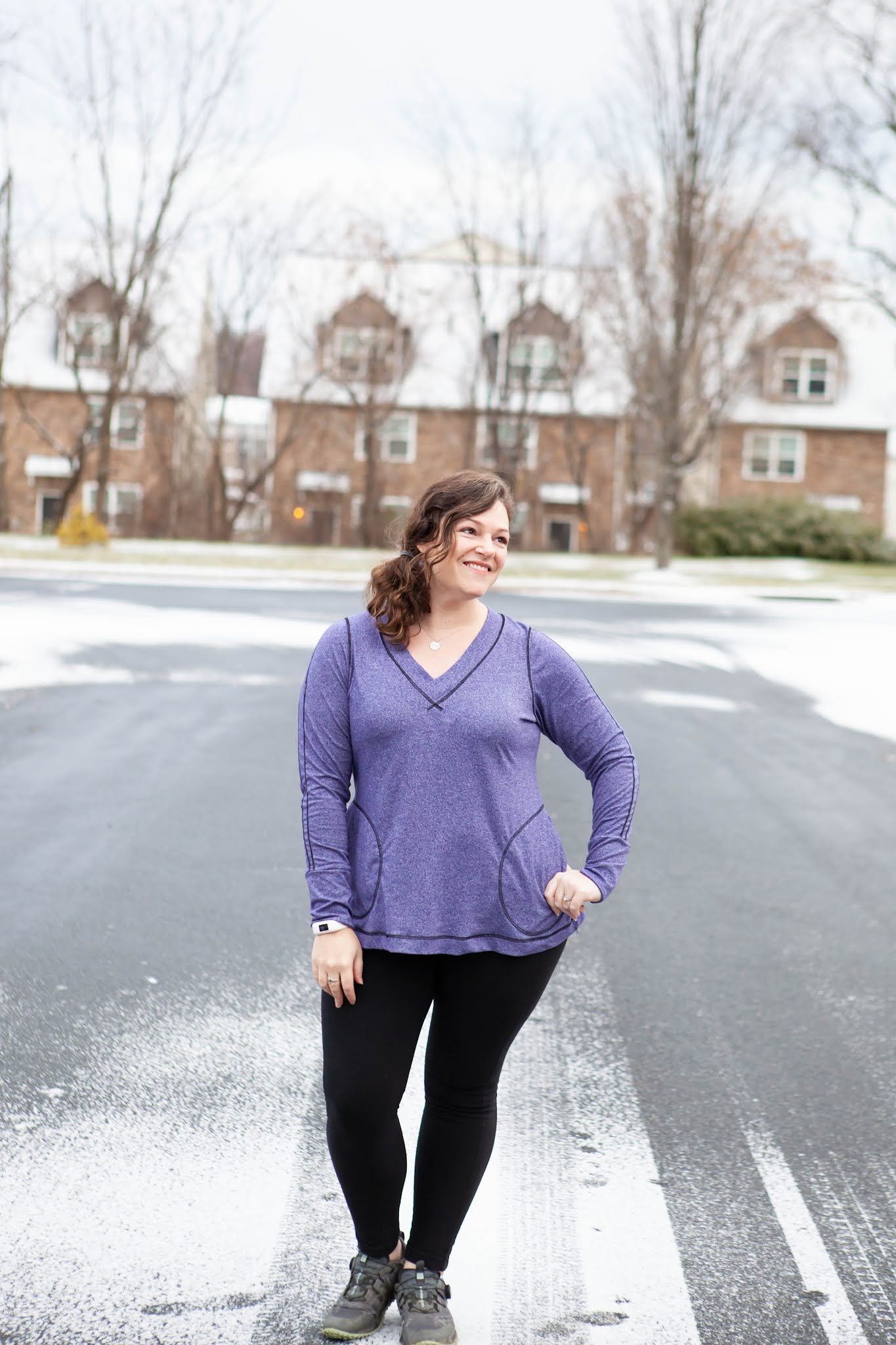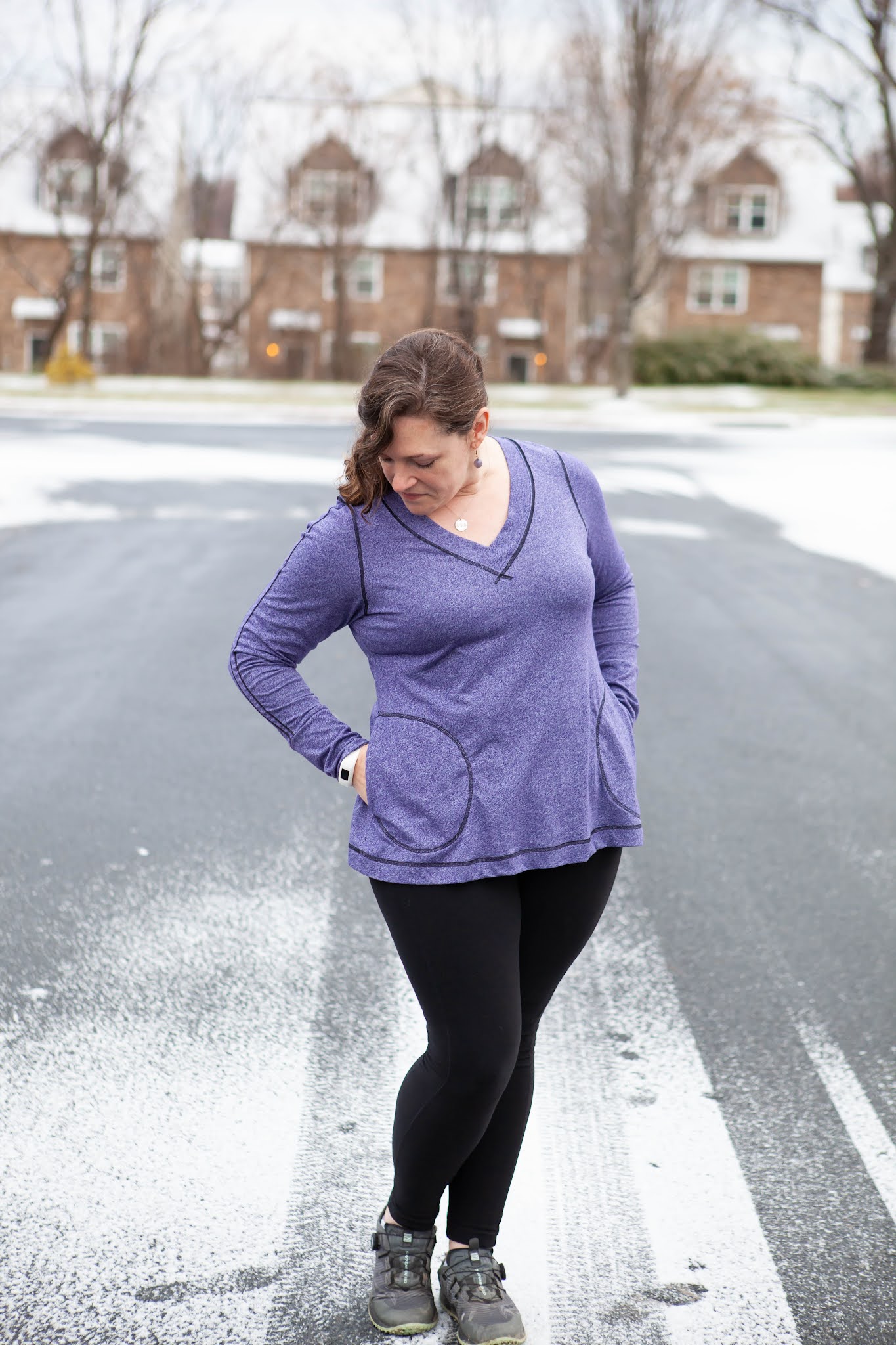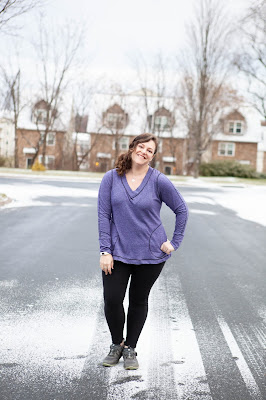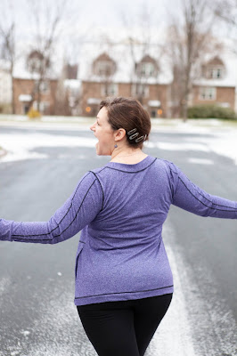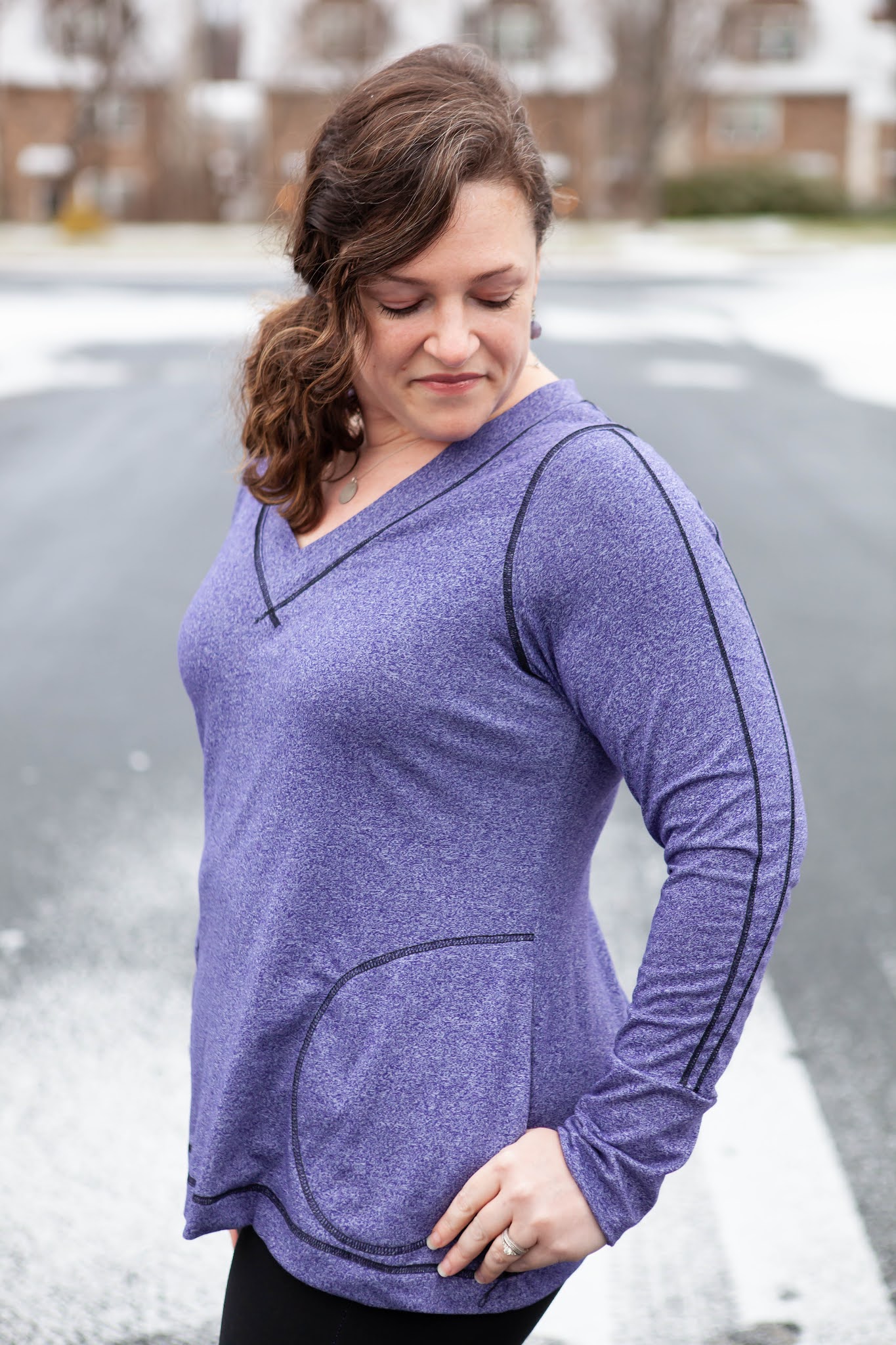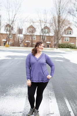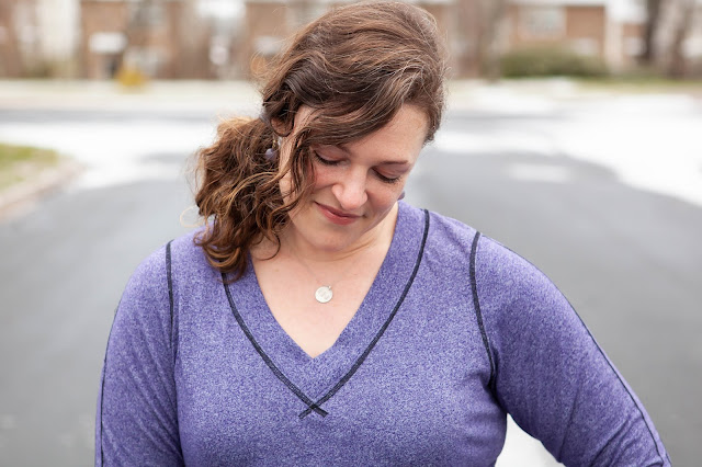 I went with the top length for my Vivacious - I added 1 inch of length since I wasn't adding the banded hem but wanted to keep it long enough to wear with leggings. I realized that I keep making hoodie versions of this pattern, so I went with the wide band V neck and I think I have found my favorite new winter top. I made this one out of a space dyed athletic knit with primarily 2 way horizontal stretch. I went to town with my coverstitch - it is amazing what a difference adding some fun top stitching can bring. For the sleeves, I simply followed the lines of the sleeve insert, tracing them onto my fabric and then stitching along the lines. At the neckline, I overlapped the stitching at the front of the V to accent the shape. The results are a sporty top perfect for working out or hanging out.