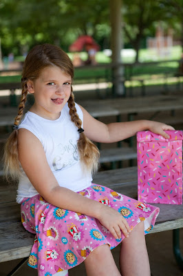 Paired with this circle skort, I have a tank hack of the EBTKS Henley. I simply took the band lengths from the coquette for this quick and easy hack. I added this fun 'One Smart Cookie' design to pull the outfit together without making it a top that could only be worn with this skirt. She'll be able to pair this tank with her new Phesh Jeggings from yesterday along with any of the other bottoms in her drawer.