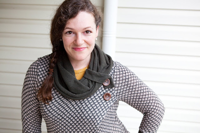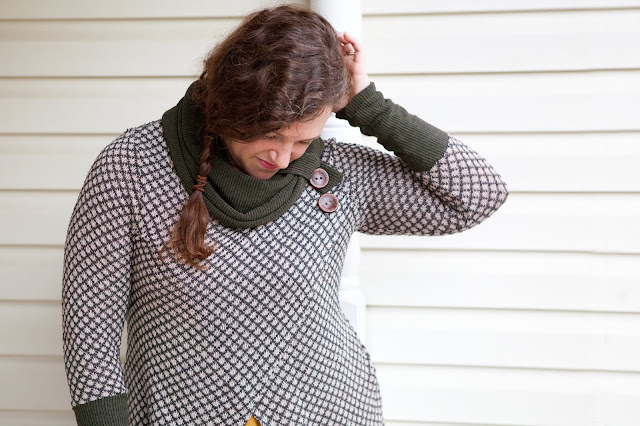 I started with a beautiful combination of sweater knits from Boho Fabrics. The main sweater knit has great texture in a medium weight and a slightly open weave which makes it not as hot. The fabric has beautiful drape and isn't chunky so it doesn't add bulk and works in a slim silhouette. The ribbed sweater knit is awesome, I actualy used the wrong side of the fabric to get more of the loden green that matched the main fabric and is such a fall staple. I loved using it at the cowl and cuffs.