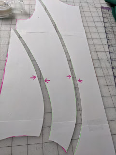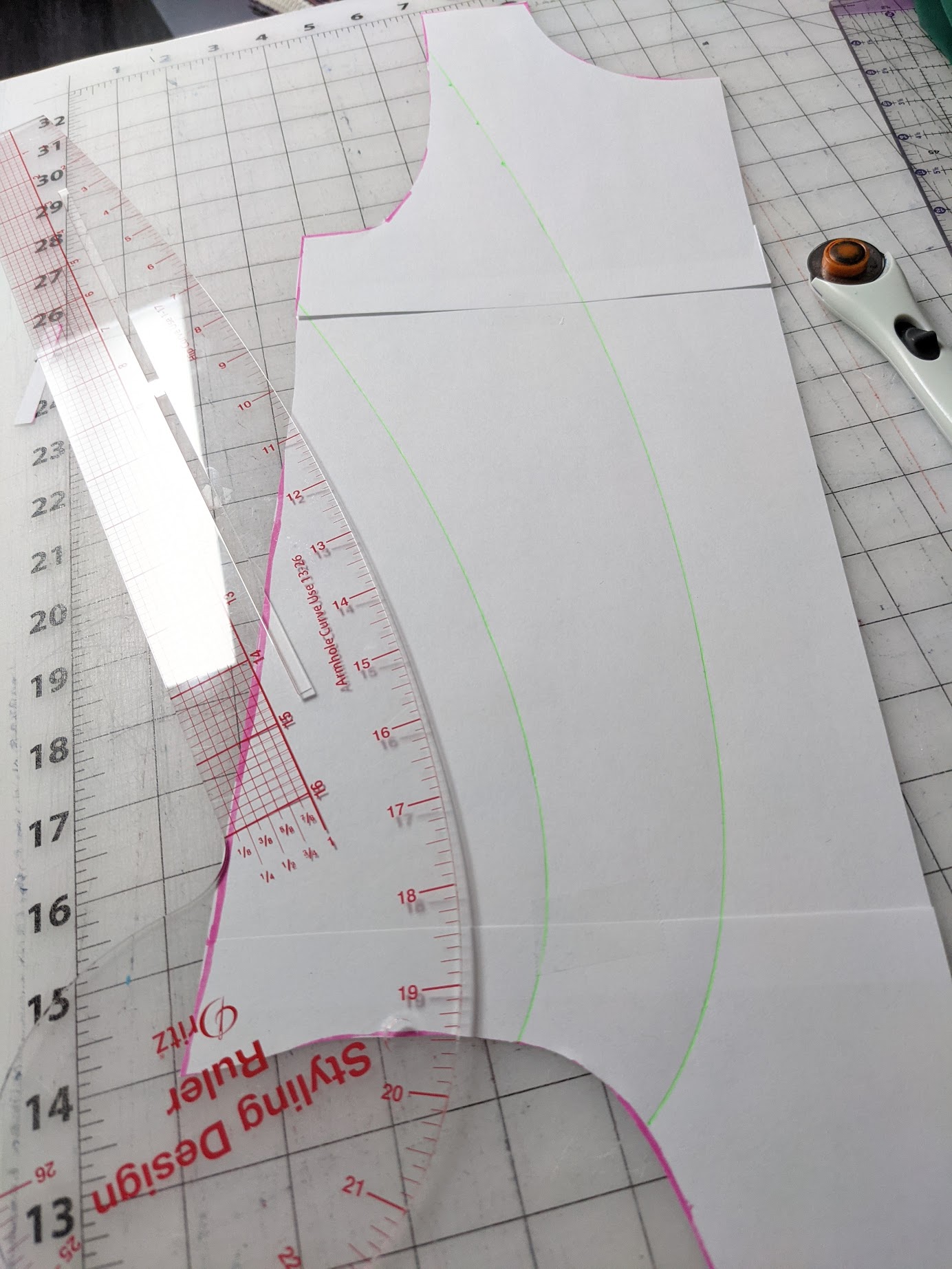 2) Decide where you want your color blocking and draw lines. I wanted curved lines, so I used my handy dandy french curve. There is no 'right' to color blocking, just go with what works for you! I wanted 1 center panel and 2 side panels on each side to show off my shades of green, so I drew two curves on my pattern piece.