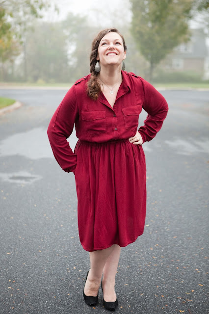 I've been getting tons of use this season out of my own Collared Shirt Dress, I purposefully picked this cranberry fabric when I made my cover version becasue I LOVE this color, and because it is perfect for all the Fall and Winter holidays.