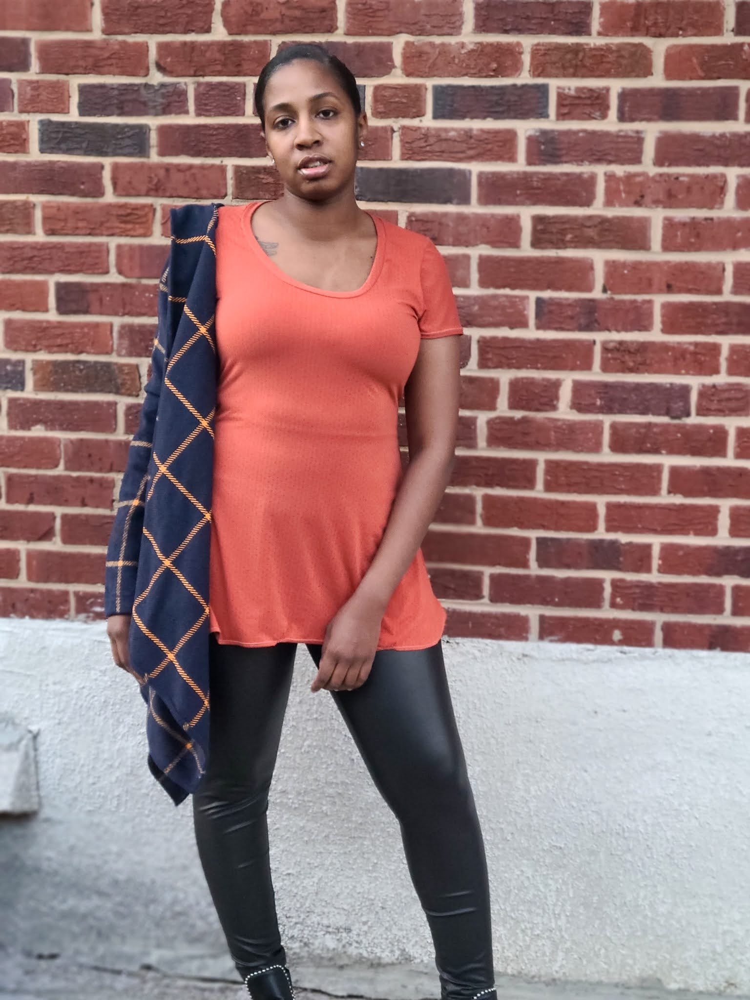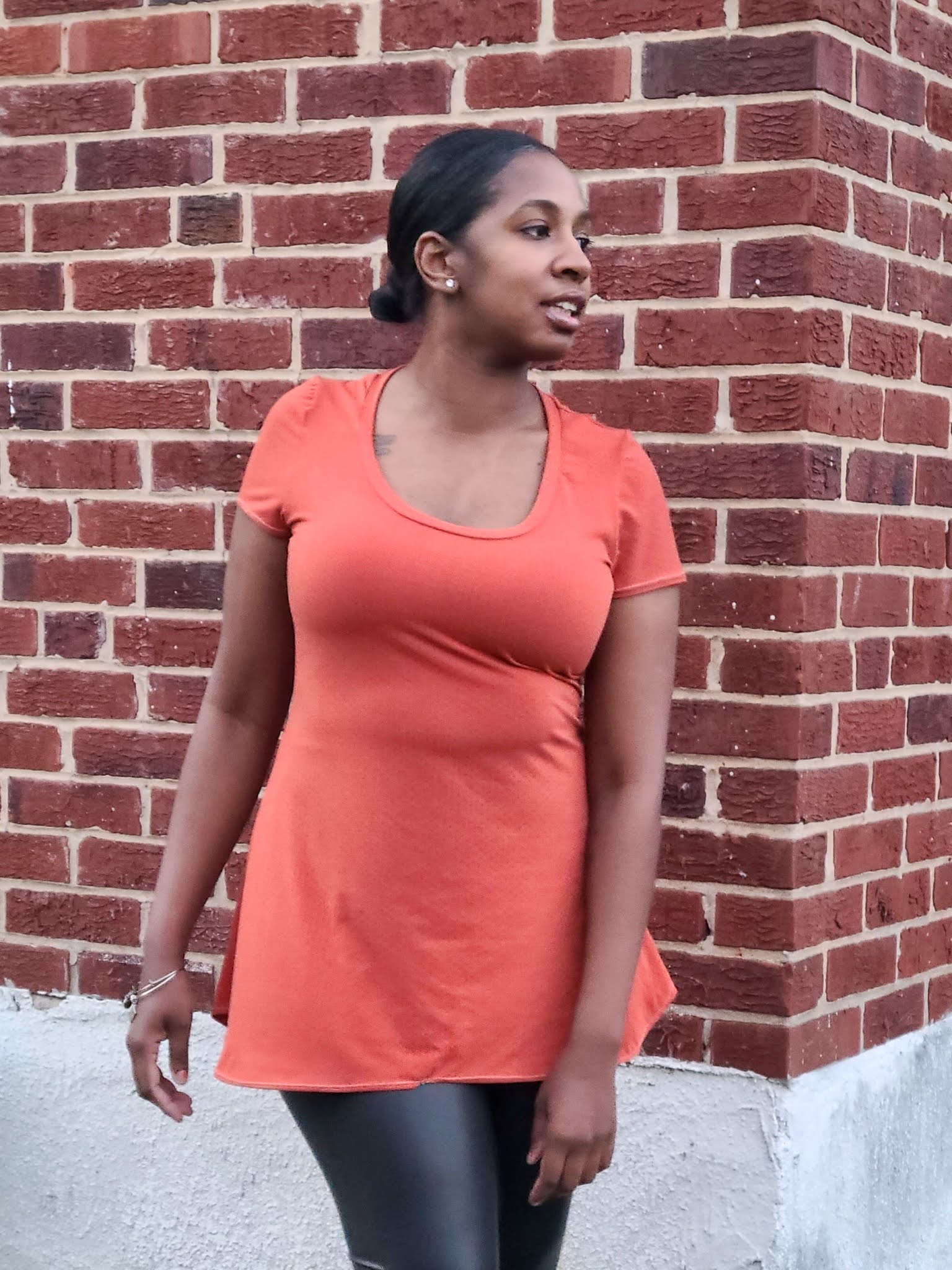 I used a Pointelle Jersey Knit from The Fabric Snob for this top. This fabric is so soft and comfy. . The burnt orange color is not one that I usually wear, but it turned out to be perfect for my skin tone.