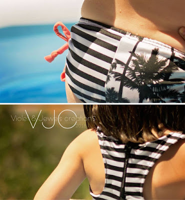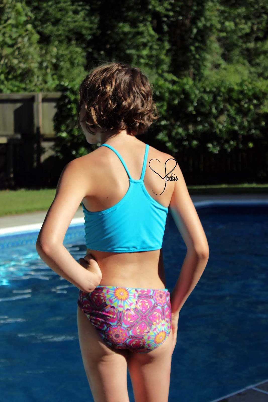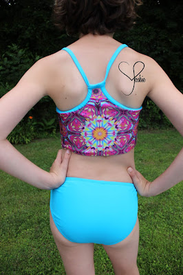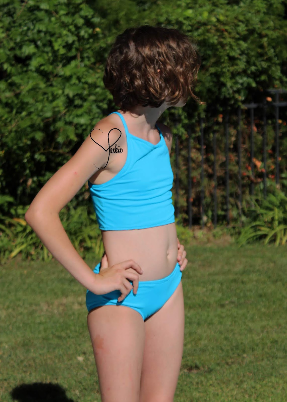 And now you have a fully reversible tankini. By binding all the openings, with the exception of the bodice hem, all seams and elastics are fully enclosed. The special girl can wear the suit in a variety of ways, mixing and matching to her heart’s content. I hope she loves it as much as my daughter loves her suit!