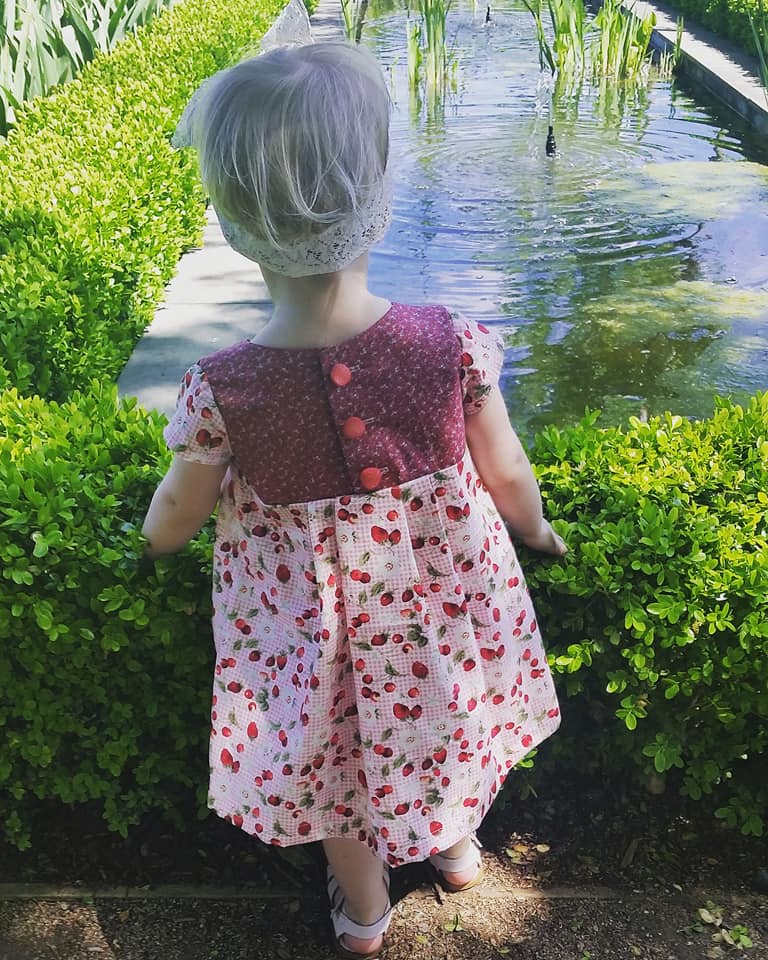 Last but not least, we have Beck Smith who also combined the Day by Day bodice with the Squared Away short sleeve and pleated skirt. Beck went with an inverted pleat and I love how it aligns with the trim on the bodice of the Day by Day. This is the perfect dress for southern falls, or even summer weather on the other side of the world! Just goes to show how perfect these patterns are year round.