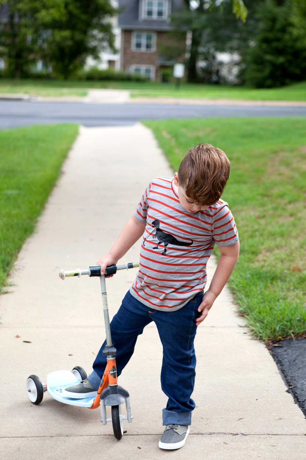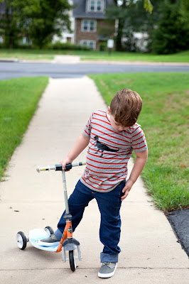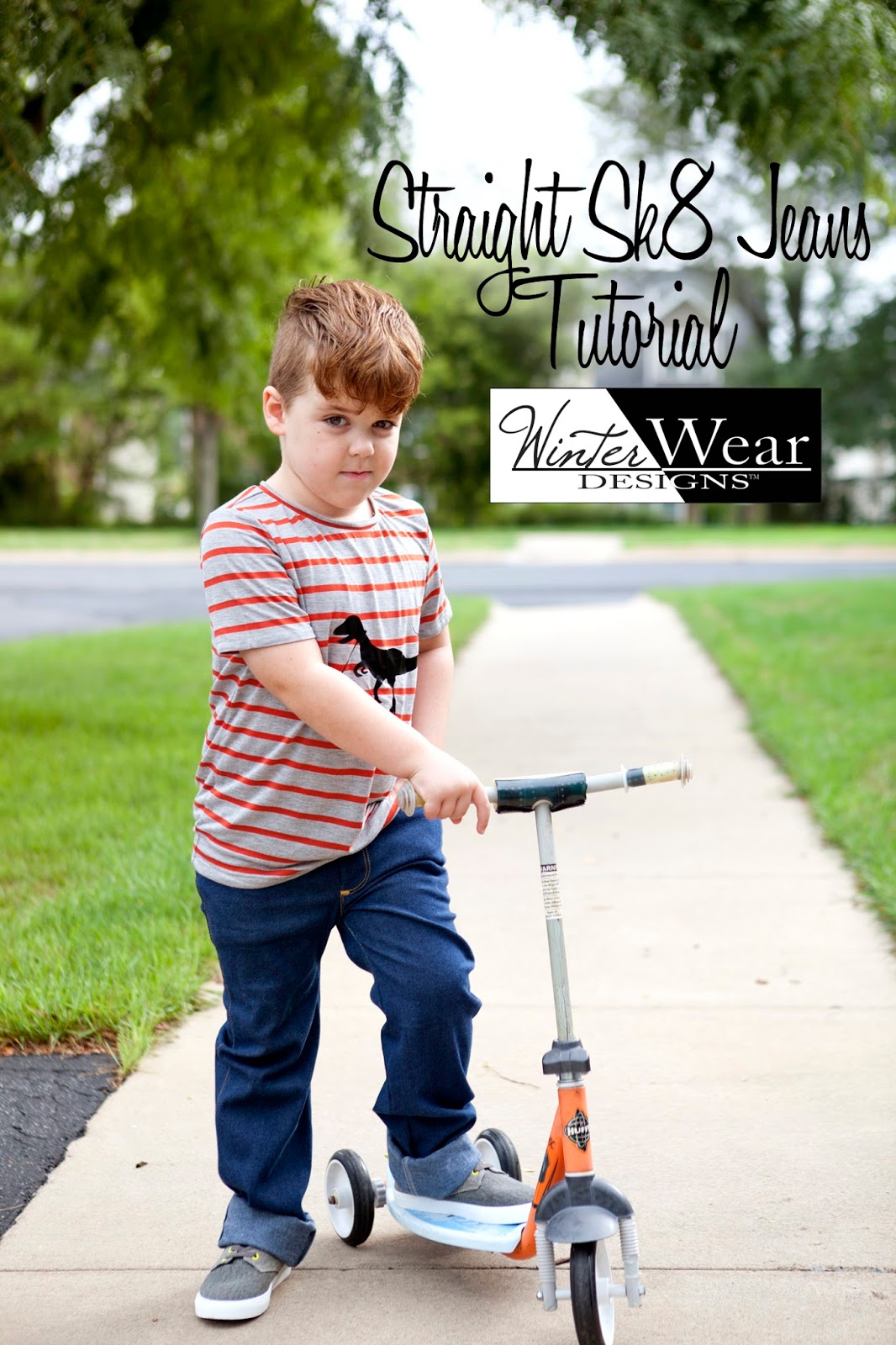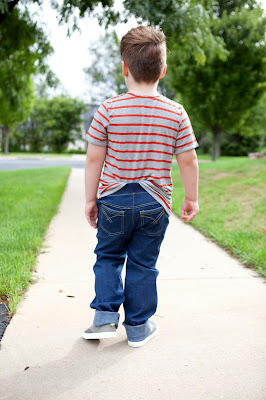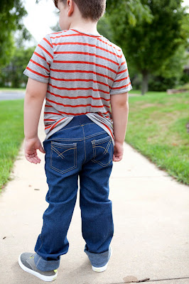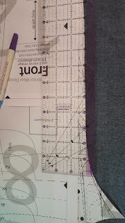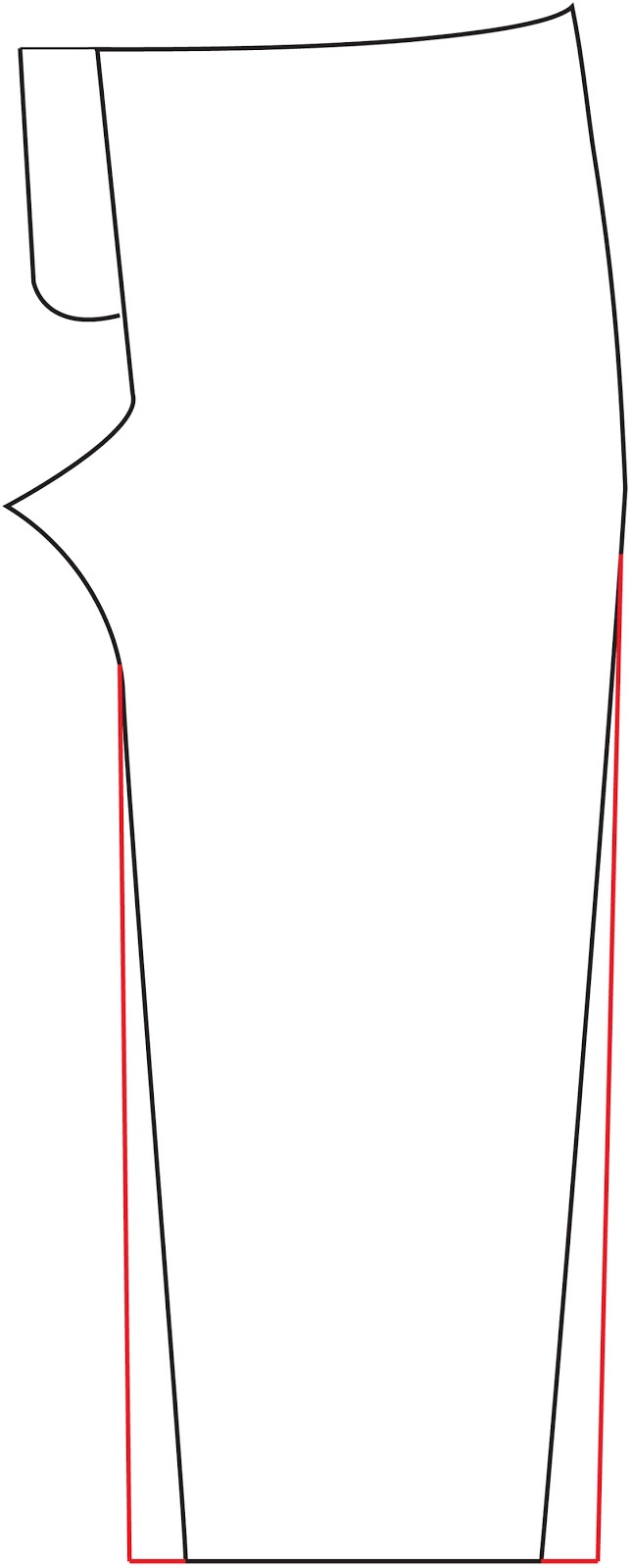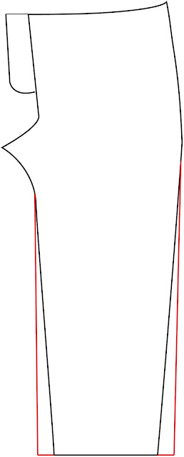 - For the Boys Sk8's: Take a straight edge and line it up with the end of the curve of the inseam. Slide it out until is is 1/2 inch from the edge of the leg. (my clear ruller has a handy dandy purple section that is 1/2 inch making it easy to line up the inside of the purple section with the top of the inseam.) You are adding width to this portion of the leg to make the fit correct for a straight leg. Draw the new inseam straight down, and you will end about 1 inch in from the original inseam hem. Repeat for your outseam, lining up your straight edge with the end of the curve coming off the hip.