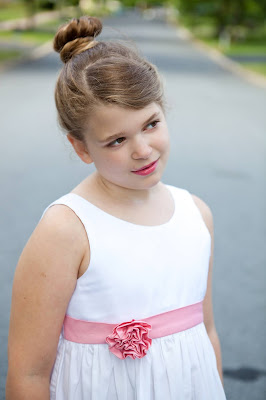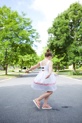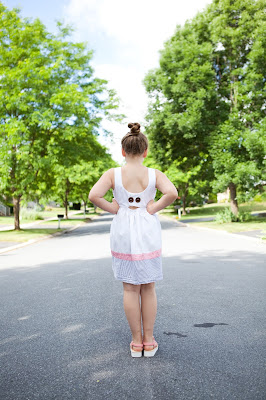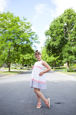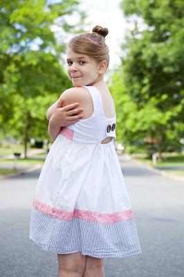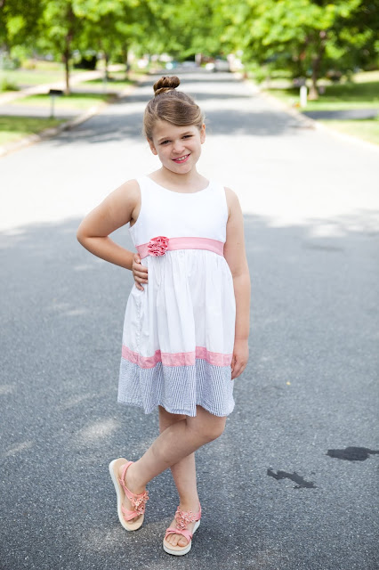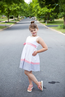 Bada bing, bada boom and my girl has a new summer dress that she love and I love. I was able to prety closely match the whites with an old white button up shirt of my husband's so all the fabric dress remained an upcycle project. What a great way to dive back into my own love of sewing!!!