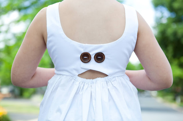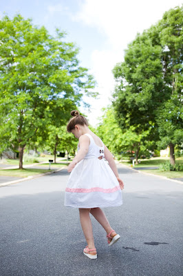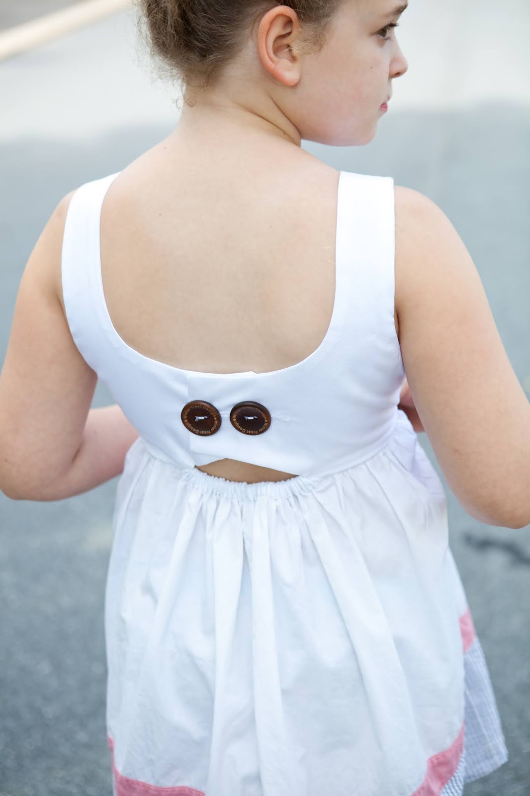I have many bodices that would have worked with this skirt, but I quickly gravitated to the Fleur Dress. My girl is all about tank style things right now, and she loves back details that are fun - check and check. While the Fleur design has pleats and flanges, I knew the existing gathered skirt would pair perfectly and it exactly matched the length needed for the 'vintage' above knee length. The Fleur Dress and Tunic is one of our $4 Sale Patterns this week too!!!