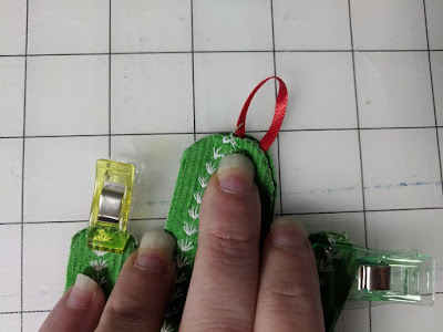4) Lay your Main and lining pieces wrong sides together. Make sure to fold your ribbon in half into a loop and sandwich the raw ends of your ribbon between the two layers at the top. *You can cut your ribbon longer for a longer loop.*